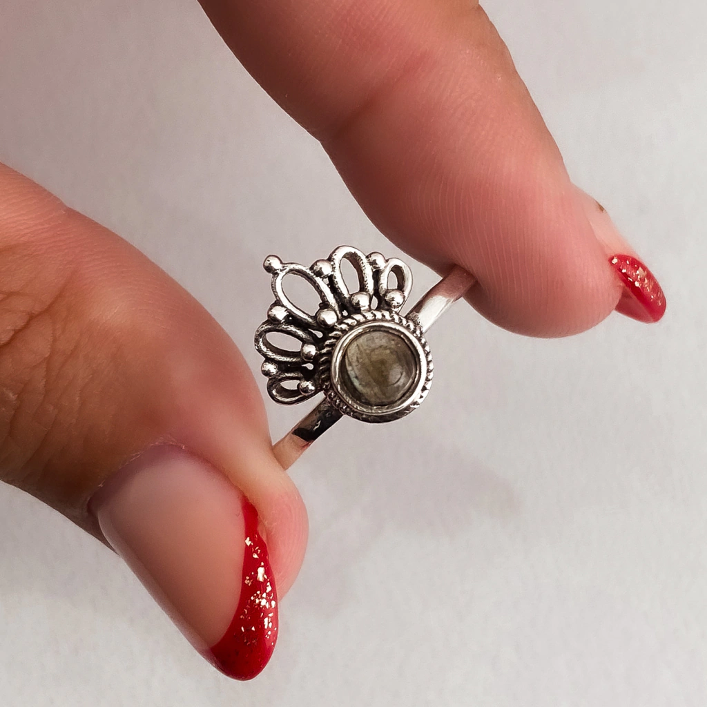 Anillo con detalles labrados y piedra preciosa, de plata 925.