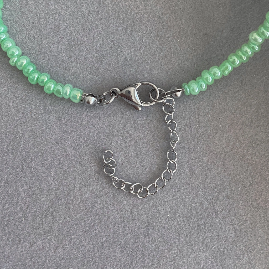 CONJUNTO CON MOSTACILLAS COLOR VERDE Y PALABRA AMISTAD CON BROCHE DE ACERO QUIRÚRGICO