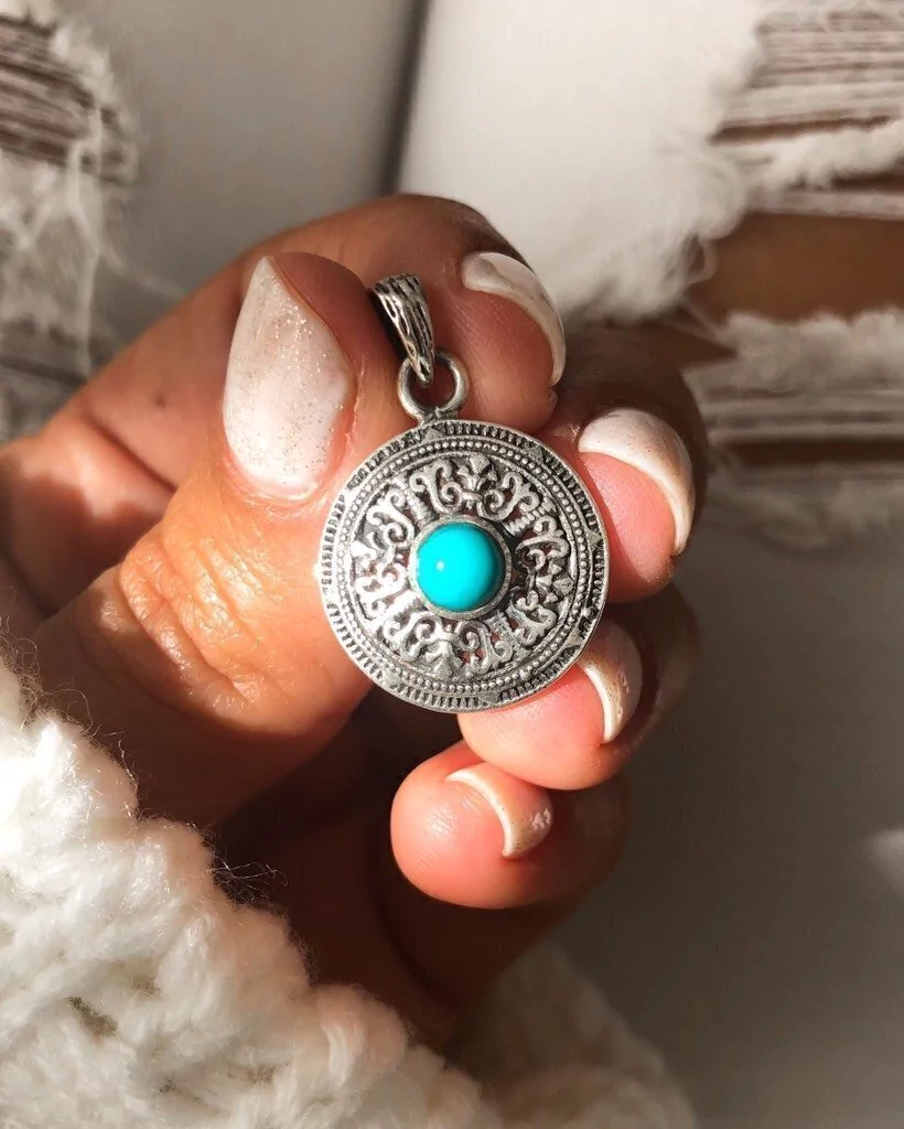 DIJE MEDALLA LABRADA CON CENTRO PIEDRA TURQUESA DE PLATA 925